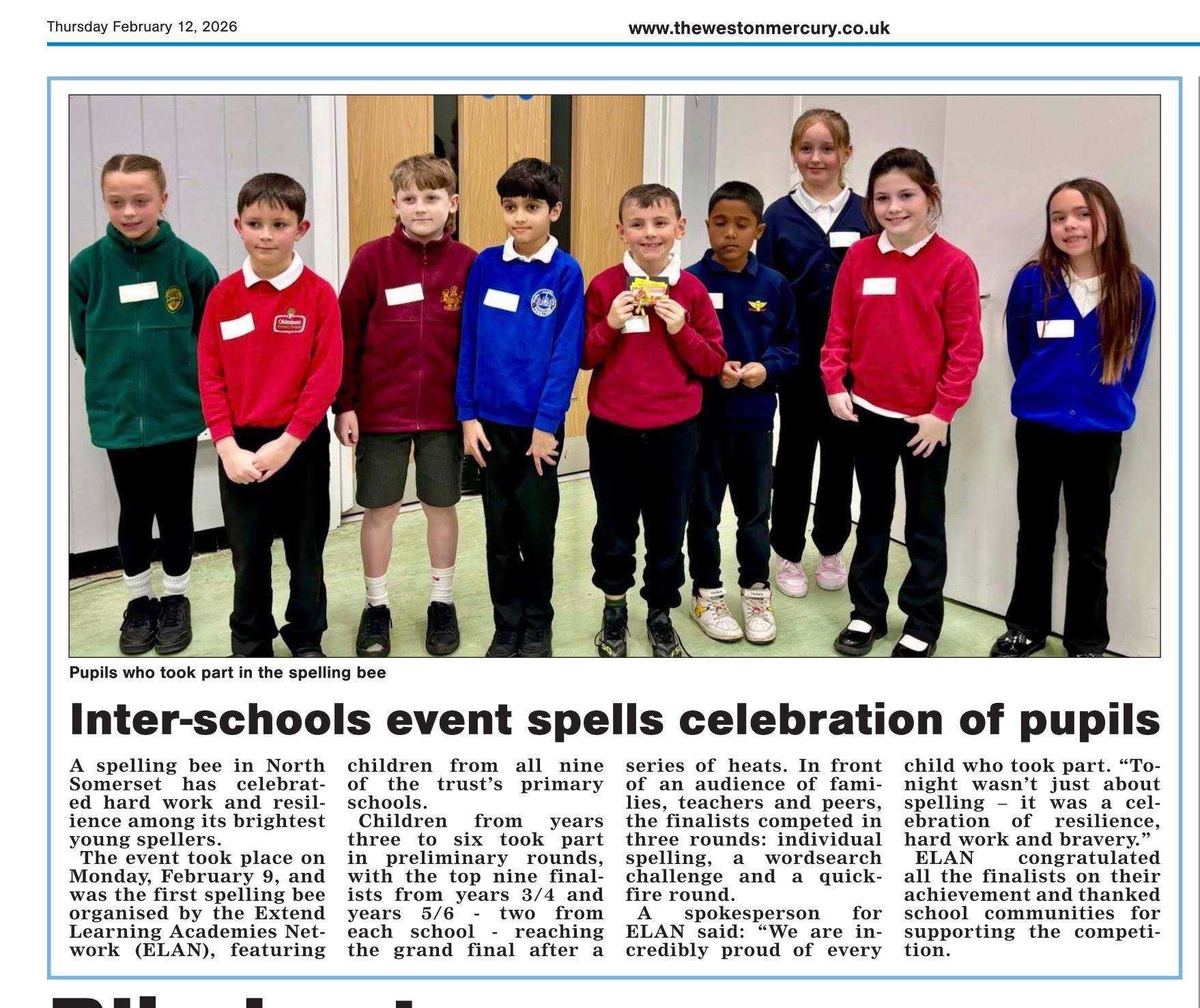 Extend Learning Academies Network (ELAN) celebrated a landmark event on 9 February 2026 with its very first ELAN Spelling Bee, bringing together pupils from all nine ELAN primary schools: Banwell, Bournville, Locking, Mead Vale, Mendip Green, Milton Park, Oldmixon, Walliscote and Windwhistle.